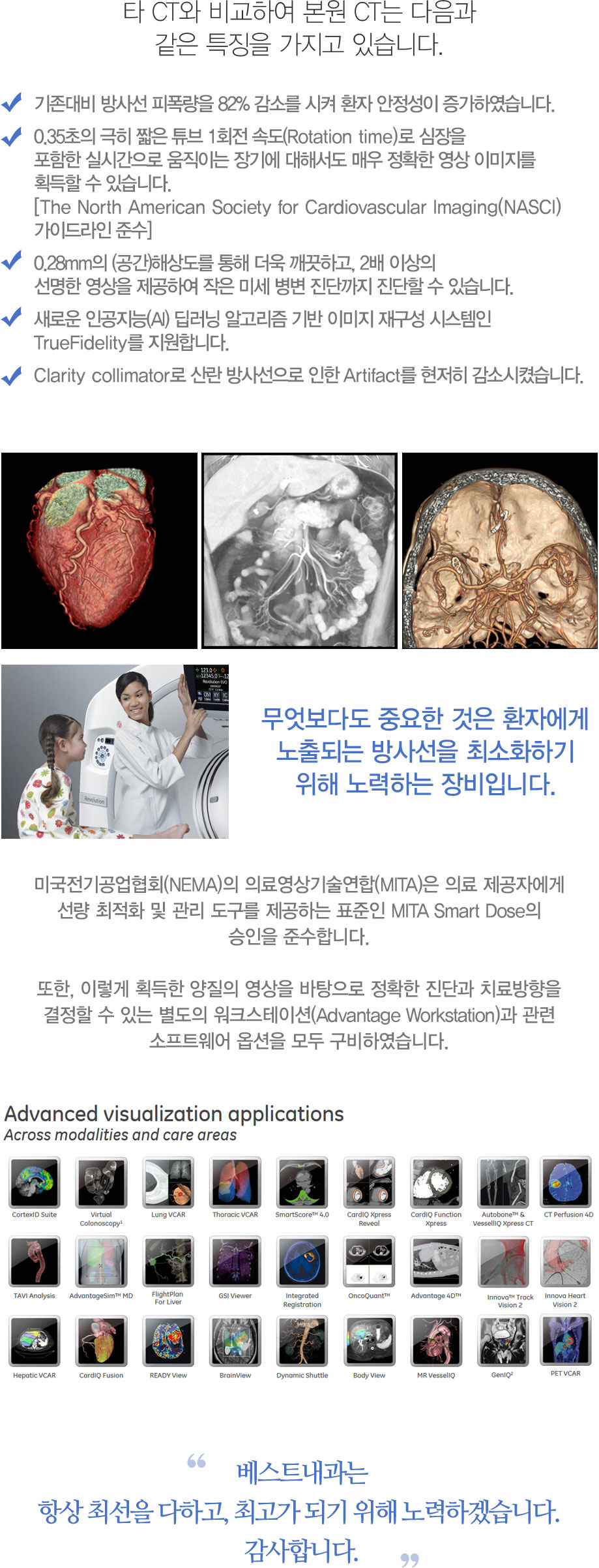 Ÿ CT Ͽ CT Ư¡ ֽϴ. 1. 缱 82% Ҹ ȯ Ͽϴ. 2. 0.35 ª Ʃ 1ȸ ӵ(Rotation time) ǽð ̴ ⿡ ؼ ſ Ȯ ̹ ȹ ֽϴ.[The North American Society for Cardiovascular Imaging(NASCI) ̵ ؼ] 3. 0.28mm ()ػ󵵸 ϰ, 2 ̻ Ͽ ̼ ܱ ֽϴ. 4. ο ΰ(AI) ˰ ̹ 籸 ý TrueFidelity մϴ. 5. Clarity collimator 缱 Artifact ҽ׽ϴ. ٵ ߿ ȯڿ Ǵ 缱 ּȭϱ ϴ ְ Դϴ. ̱ȸ(NEMA) Ƿ῵(MITA) Ƿ ڿ ȭ ϴ ǥ MITA Smart Dose ؼմϴ. , ̷ ȹ Ȯ ܰ ġ ִ ũ̼(Advantage Workstation) Ʈ ɼ Ͽϴ. Ʈ ׻ ּ ϰ, ְ DZ ϰڽϴ. մϴ.